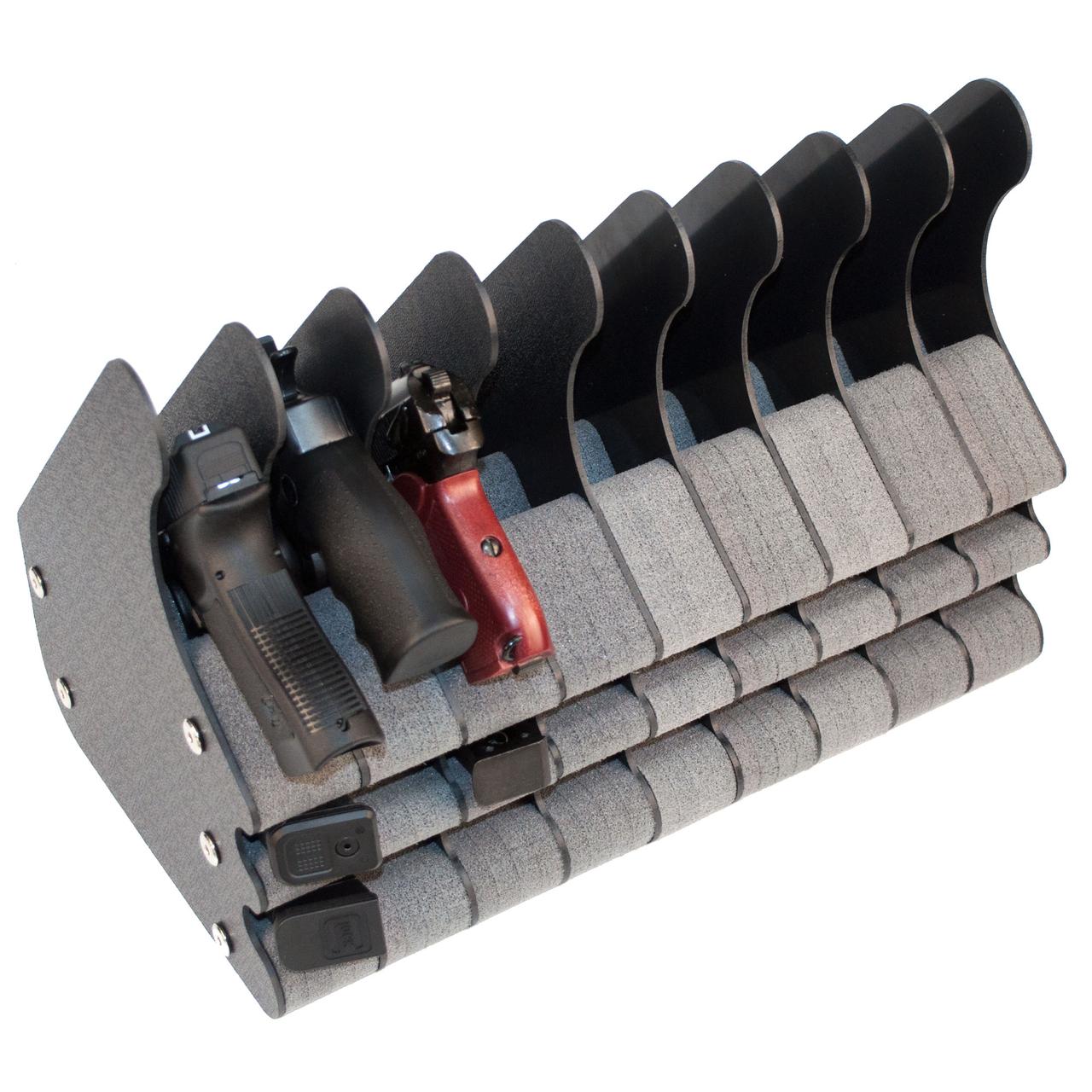 Конструкція зроблена таким чином, що пістолет фіксується в підставці під кутом, при цьому не торкається корпусу сусідніх пістолетів. Пістолет легко і швидко дістається з підставки.